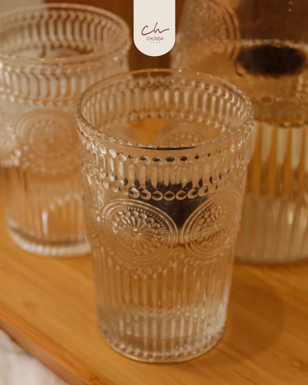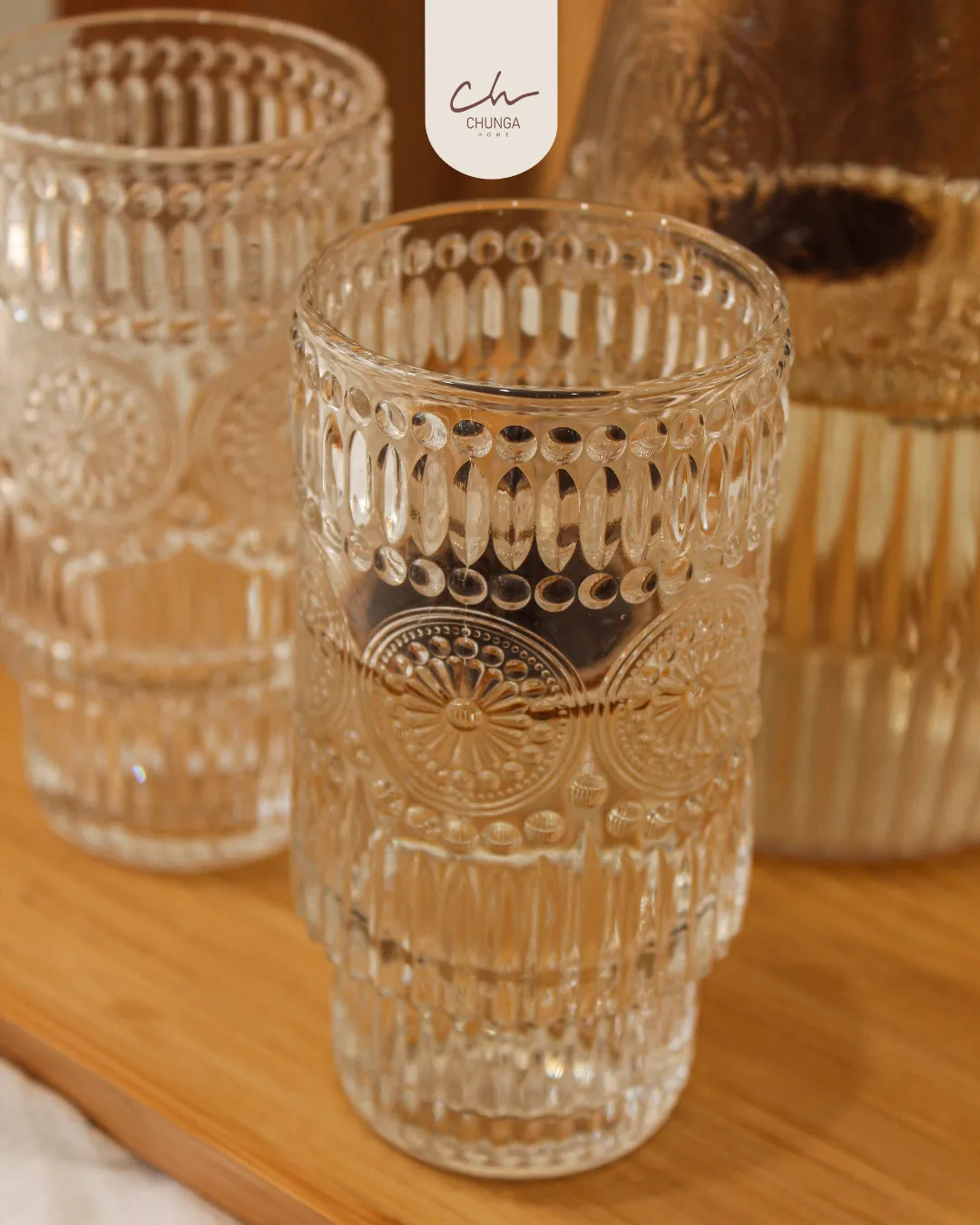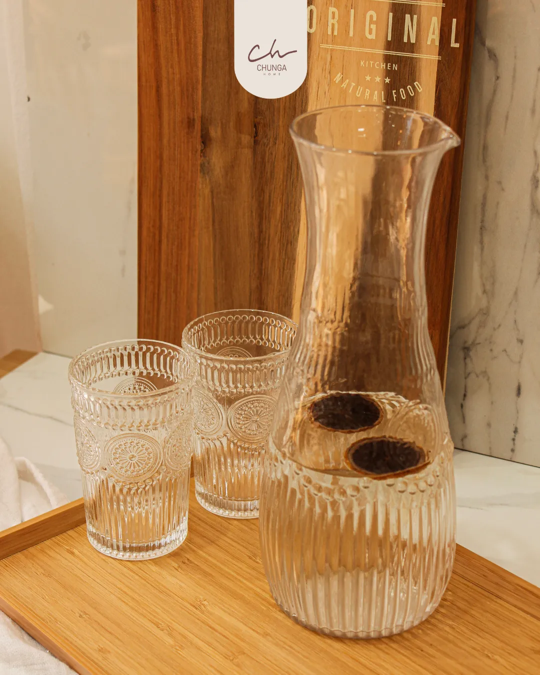 Este encantador set de cristalería, que incluye una elegante jarra de vidrio con cuerpo acanalado y un par de vasos bajos con un distintivo patrón de medallón, es la combinación perfecta para infundir tus bebidas con estilo. Ideal para añadir un toque de encanto vintage y funcionalidad a tu cocina, mesa o cualquier rincón de tu hogar, como se aprecia en la imagen con una refrescante infusión.