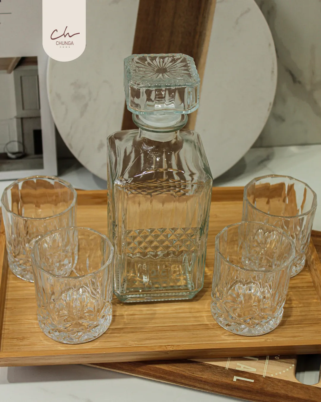 Este exquisito set de cristalería eleva la experiencia de disfrutar tus licores favoritos. Compuesto por un robusto decantador de vidrio con un diseño labrado de intrincados patrones geométricos y una tapa a juego, acompañado de un juego de vasos bajos con el mismo estilo distinguido, es perfecto para servir whisky, brandy o cualquier bebida espirituosa, aportando un toque de lujo y sofisticación a tu bar o sala.